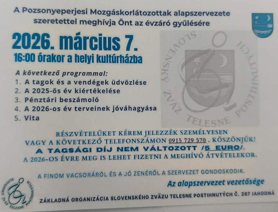 Dňa 10.01.2026 sa konala mimoriadna členská schôdza Základnej organizácie Slovenského zväzu telesne postihnutých Dunajská Streda v Dunajskej Strede v priestoroch sídla organzácie.