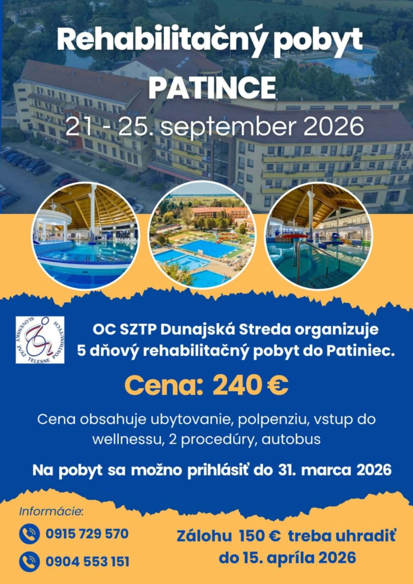 Okresné centrum Slovenského zväzu telesne postihnutých Dunajská Streda organizuje 5 dňový rehabilitačný pobyt v Patinciach. Cena 240 EUR obsahuje ubytovanie, polpenziu, vstup do wellnessu, 2 procedúry, autobus. Na pobyt sa možno prihlásiť do 31.3.2026 na tel. č.: 0915 729 570 alebo na 0904 553 151. Zálohu 150 EUR treba uhradiť do 15. apríla 2026.